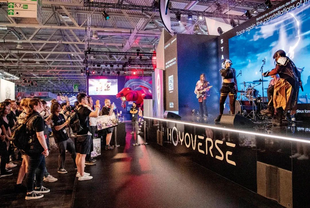 2023年8月23日,,,德國(guó)科隆游戲展期間,,,,人們?cè)诿坠握古_(tái)觀看樂(lè)隊(duì)表演游戲歌曲。。。圖/新華